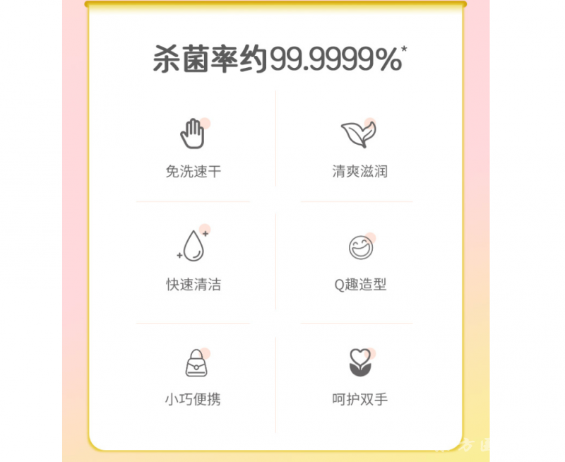 | 功能主治 | 消字号,以聚六亚甲基胍为主要有效成分,不含乙醇,轻松杀菌,高铁飞机可携带,免洗消毒,温和低刺激,便携方便。 |